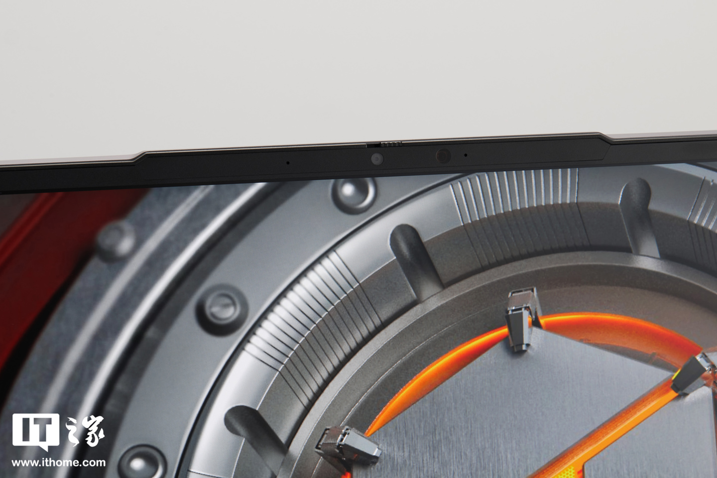 笔记本的 B 面是一块 16 英寸的 MiniLED 耀月屏,屏幕左右两侧的边框比较窄,上下部分略宽一些,同时顶部还有凸起的 1080p IR 红外摄像头和传感器区域,这种设计也方便用户平时打开笔记本。
