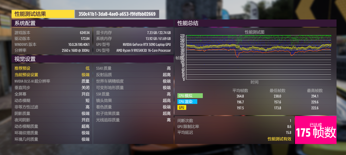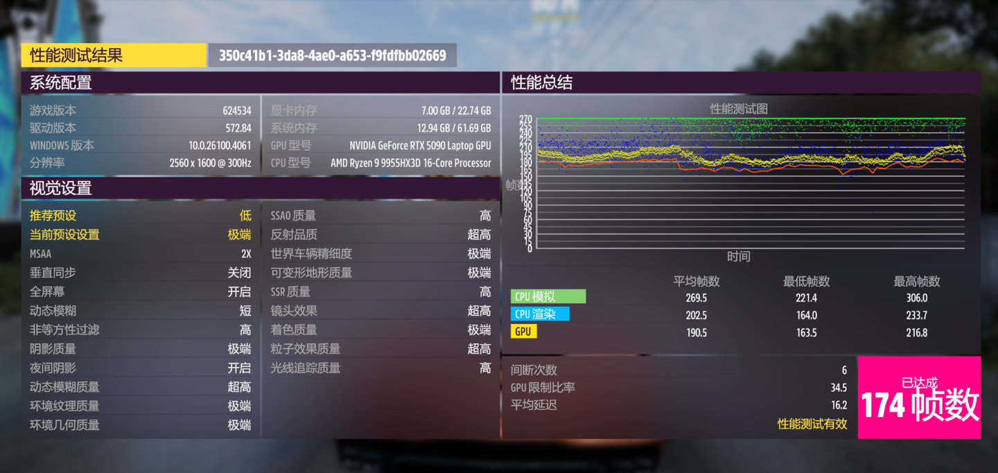 接下来还有《极限竞速:地平线 5》,先在游戏预设的极端画质下开启光线追踪高,关闭 DLSS 相关的功能,运行性能基准测试,得到 174 FPS 的平均帧率,对于赛车模拟游戏来说,这个帧率无疑是丝滑流畅了。