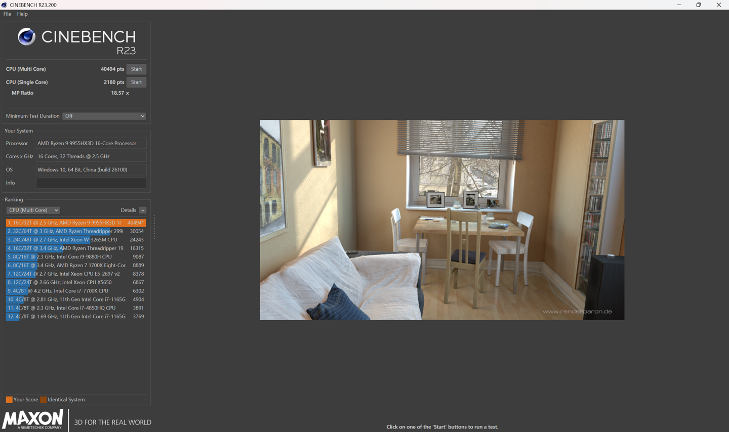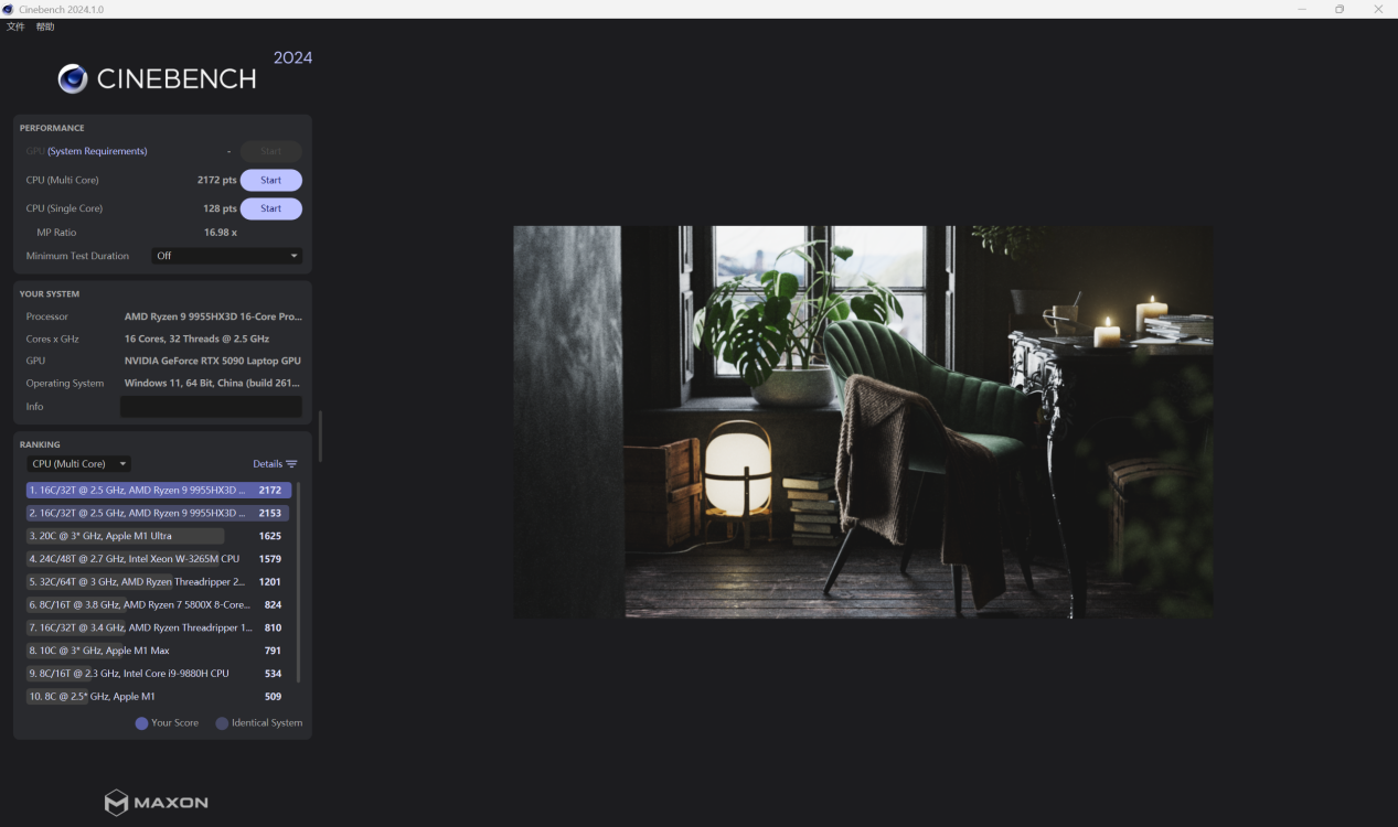 首先使用 CineBench R23 对 AMD 锐龙 9 9955HX3D 处理器进行跑分性能测试,得到单核 2181 pts,多核 39451pts 的成绩,性能确实不俗。
