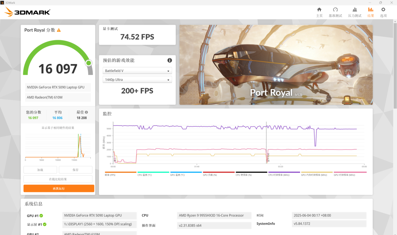 在代表光线追踪性能的 Port Royal 分数得到 74.52 FPS 的成绩,综合分数为 16097 分。