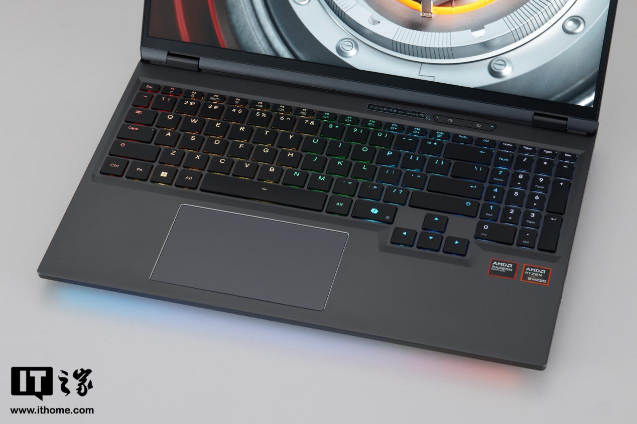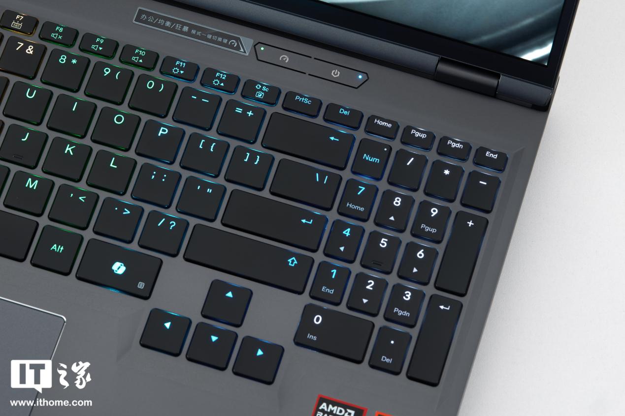 C 面是键盘和触控板区域,苍龙 16 Ultra 采用全键无冲的人体工程学键盘,键程为 1.4mm,有独立数字小键盘,1600 万色单键 RGB 可调。键盘区域上方有电源按键和办公、均衡、狂暴三种模式快速切换的按键。