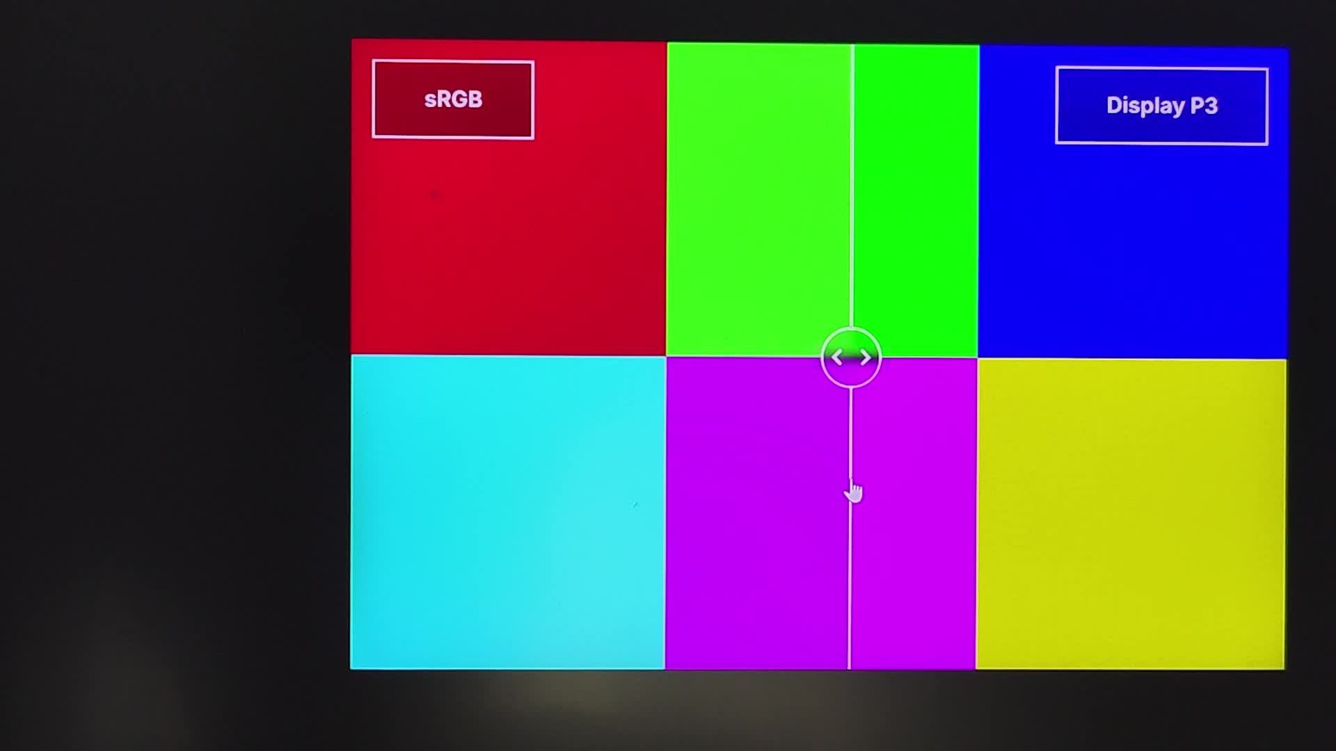 再比如下面这张图片,通过中间的滑轨来实时切换 sRGB 色域和 Display P3 色域显示的不同效果,如果是普通屏幕,根本无法看出滑轨滑动时,不同色域显示区域的差别,但是在苍龙 16 Ultra 这块屏幕上,拖动滑轨,就能清楚看出 sRGB 显示的部分色彩明显更暗淡一些,没有 Display P3 色域显示的部分那么饱满。
