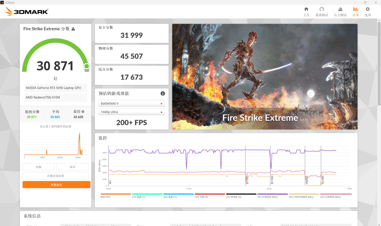 Fire Strike Extreme 的显卡分数为 31999 分,综合得分 30871 分。