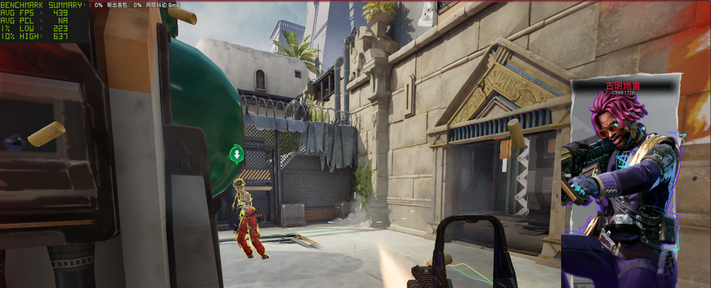 不仅如此,小编还测了另一款同类型的竞技游戏,网易的《界外狂潮》,这款游戏在 1080P 最低画质下,局内对战测得平均帧率可以达到 439 FPS,十分流畅。