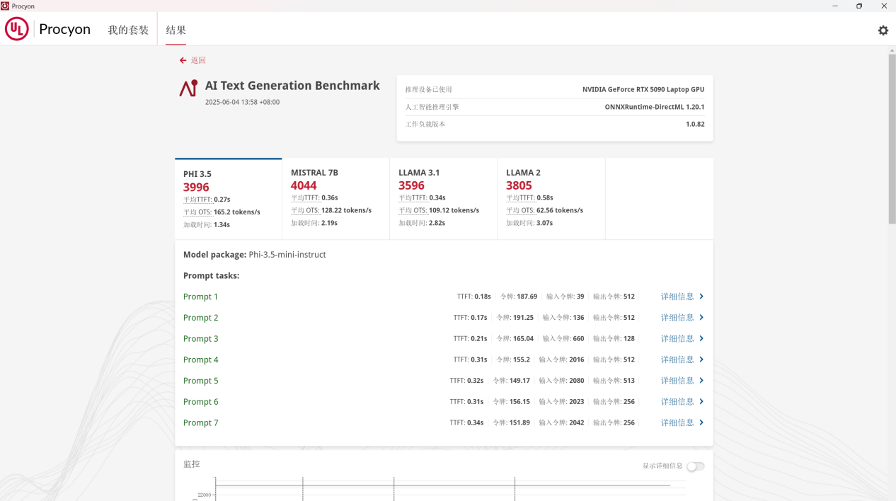 接下来是 AI Text Generation Benchmark 文字生成的测试,PHI 3.5 模型下得分 3996,平均 TTFT 为 0.27s,平均 OTS: 为 165.2 tokens / s;MISTRAL 7B 模型下得分 4044,平均 TTF 为 0.36s,平均 OTS 为 128.22 tokens / s;LLAMA 3.1 模型下得分 3596,平均 TTFT 为 0.34s,