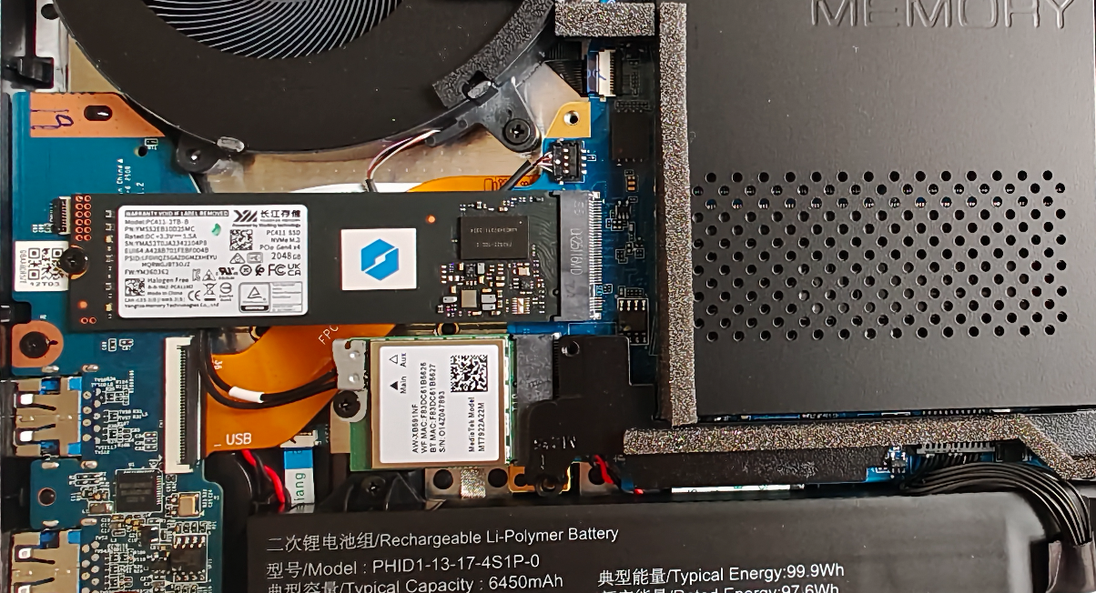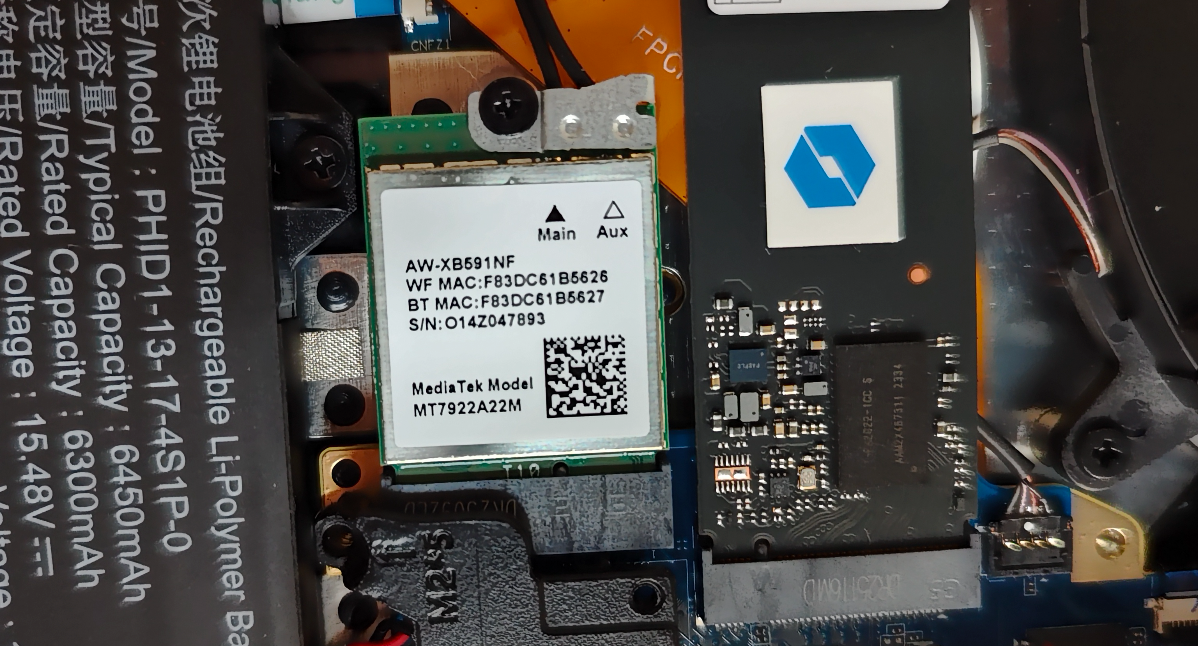网卡在预装 SSD 的旁边,为联发科的 MT7922,支持 Wi-Fi 6E。