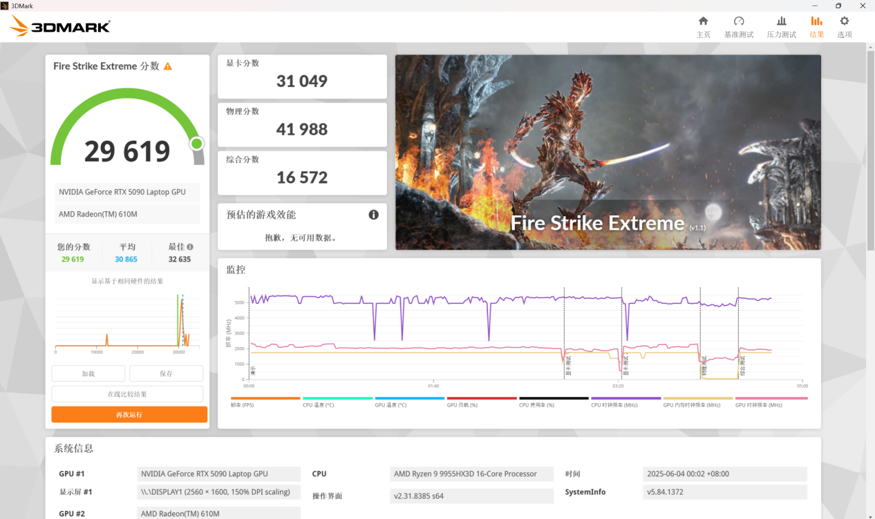 Fire Strike Extreme 中,显卡分数 31049 分,综合成绩 29619 分。