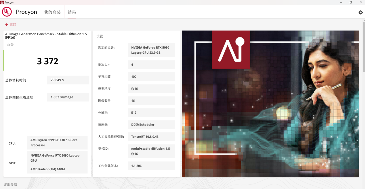 接下来小编还针对机械革命苍龙 16 Ultra 的 AI 能力体验进行了测试,使用 UL Procyon 进行 AI Image Generation Benchmark 的图片生成测试,选用 Stable Diffusion 1.5 (FP16)模型,测得总体图像生成速度为 1.853s / image,总体消耗时间为 29.649s。