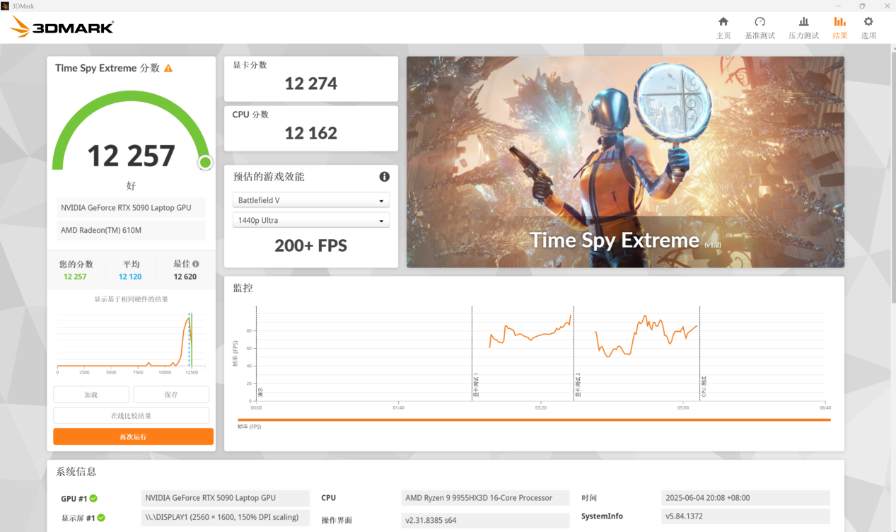 Time Spy Extreme 测试中,显卡得分 12274 分,综合表现为 12257 分。