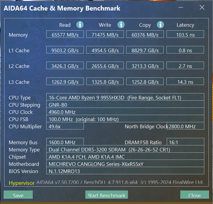 实测内存跑分数据如图所示,读取速度达到 65577MB/s,写入速度达到 71475MB/s,拷贝速度为 60376MB/s,时延为 103.5 ns。