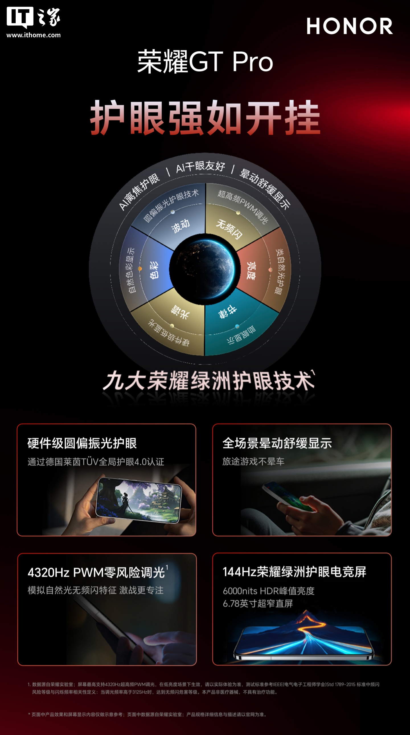 IT之家注意到,2023 年 11 月,在荣耀全新护眼技术沟通会暨荣耀护眼实验室揭牌仪式上,荣耀绿洲护眼实验室正式成立。同时宣布,荣耀 100 系列首发荣耀绿洲护眼屏,支持 3840Hz 超高频 PWM 调光。目前,荣耀绿洲护眼电竞屏已支持 4320Hz PWM 零风险调光、硬件级圆偏振光护眼等功能(以今年 4 月发布的荣耀 GT Pro 手机为例,具体功能情况需以实际机型是否支持为准)。
