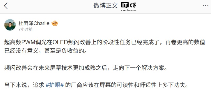 IT之家 6 月 12 日消息,荣耀 GT 系列产品经理 @杜雨泽Charlie 今日发文称:“超高频 PWM 调光在 OLED 频闪改善上的阶段性任务已经完成了,再卷更高的数值已经没有意义,甚至是负收益的。”