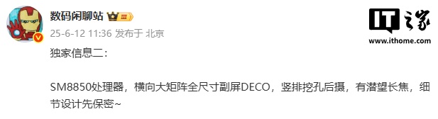 IT之家 6 月 12 日消息,据博主 @数码闲聊站 今日爆料,某厂搭载 SM8850 处理器的新机,采用横向大矩阵全尺寸副屏 DECO,竖排挖孔后摄,有潜望长焦,细节设计先保密。根据该博主此前的爆料习惯,预计为小米新机。