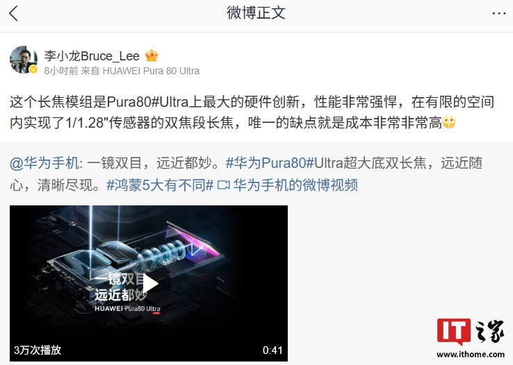 据IT之家昨日报道,华为终端 BG CTO 李小龙发文称:“这个长焦模组是 Pura 80 Ultra 上最大的硬件创新,性能非常强悍,在有限的空间内实现了 1/1.28" 传感器的双焦段长焦,唯一的缺点就是成本非常非常高。”