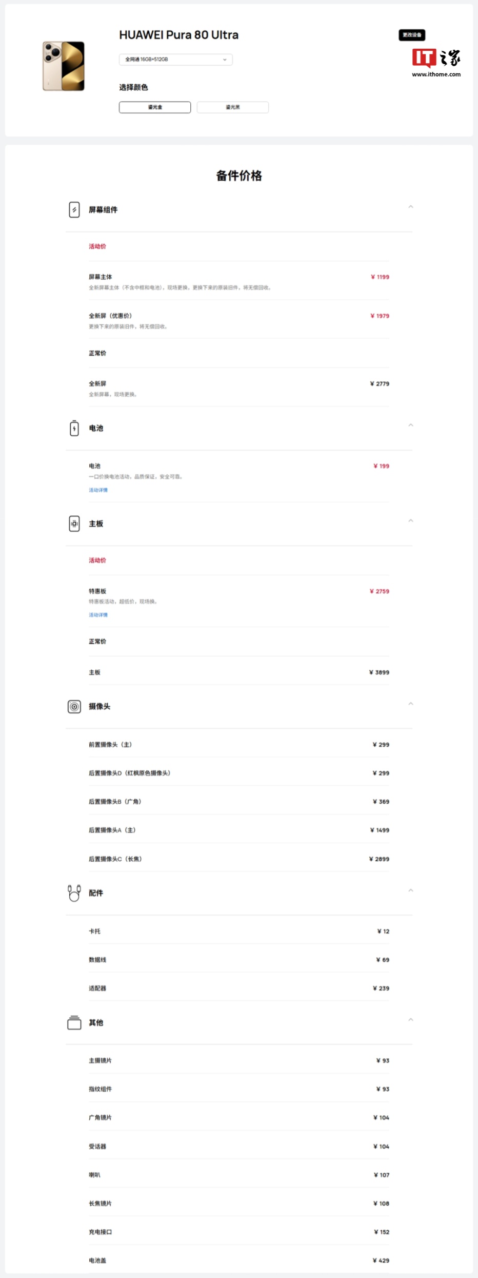 华为官方已公布了华为 Pura 80 系列手机的备件价格。IT之家注意到,华为 Pura 80 Ultra 手机后置摄像头 C(长焦)价格为 2899 元。具体如下: