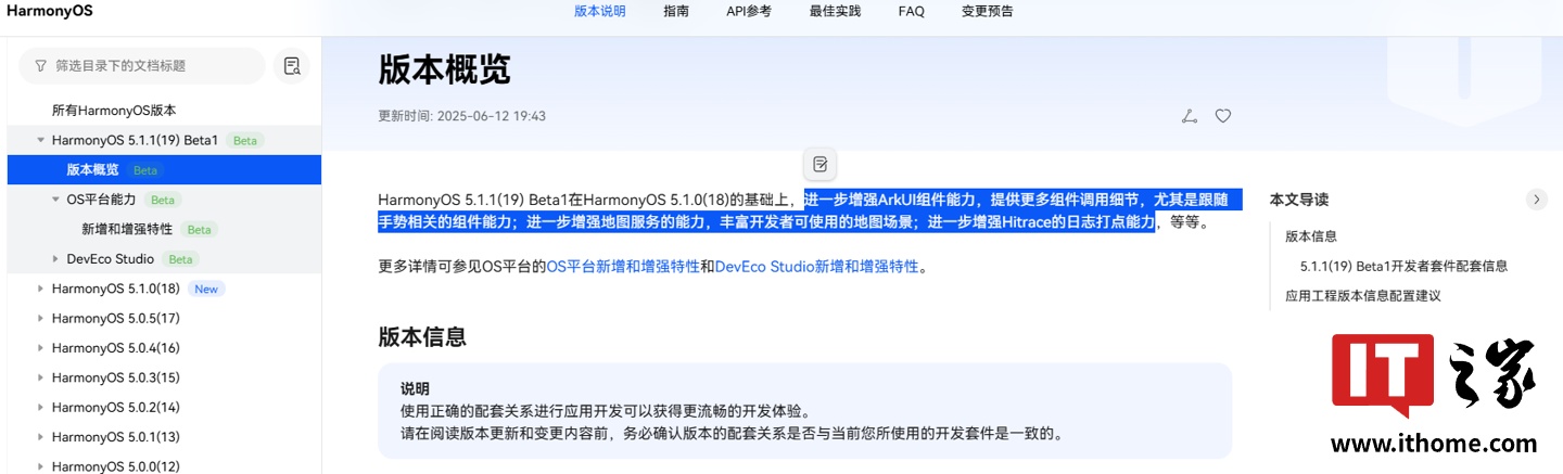 IT之家 6 月 12 日消息,华为开发者官网今日公布了鸿蒙 HarmonyOS 5.1.1 (19) Beta1 新增和增强特性。据介绍,5.1.1 (19) Beta1 在 HarmonyOS 5.1.0 (18) 的基础上,进一步增强 ArkUI 组件能力,提供更多组件调用细节,尤其是跟随手势相关的组件能力;进一步增强地图服务的能力,丰富开发者可使用的地图场景;进一步增强 Hitrace 的日志打点能力等。