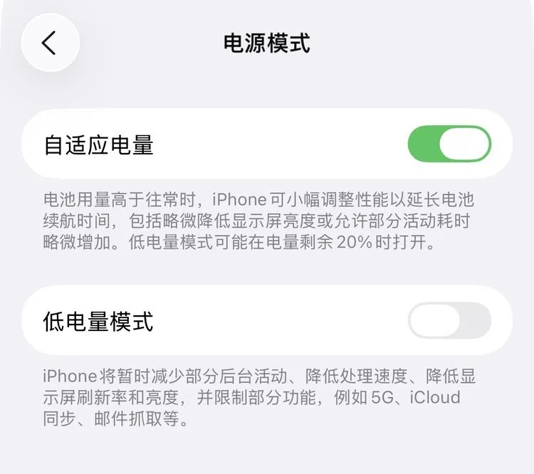 一方面,iOS 26 系统将引入「自适应电量」(Adaptive Power Mode),通过智能调节性能、降低亮度、限制后台活动来延长续航。可能是由于 Beta 版的原因,反正这一功能对于我手中目前的 iPhone 16 Pro 来说“聊胜于无”。