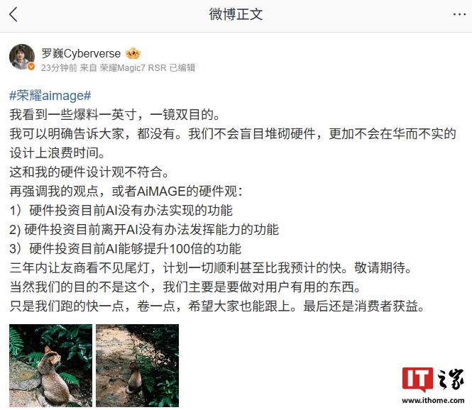 IT之家 7 月 23 日消息,荣耀首席影像工程师罗巍今日早发文重申荣耀没有爆料提到的“一英寸、一镜双目”相关配置,并表示不会盲目堆砌硬件,更加不会在华而不实的设计上浪费时间,这和他的硬件设计观不符合。其观点 / AiMAGE 硬件观如下: