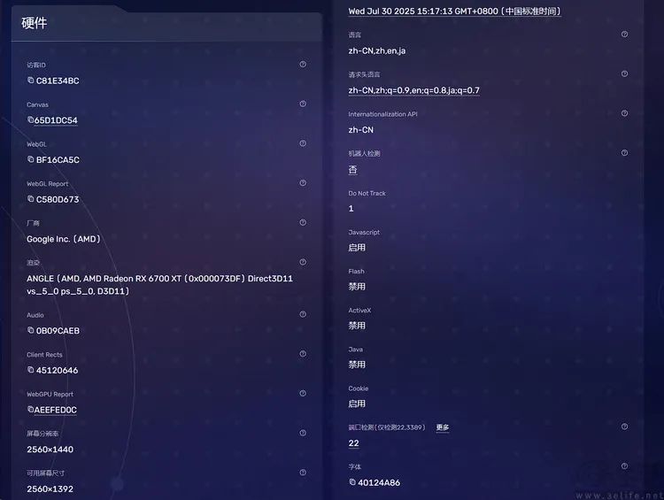 在某个专门检测浏览器指纹的网站上,可以清楚看到自己的“指纹信息”