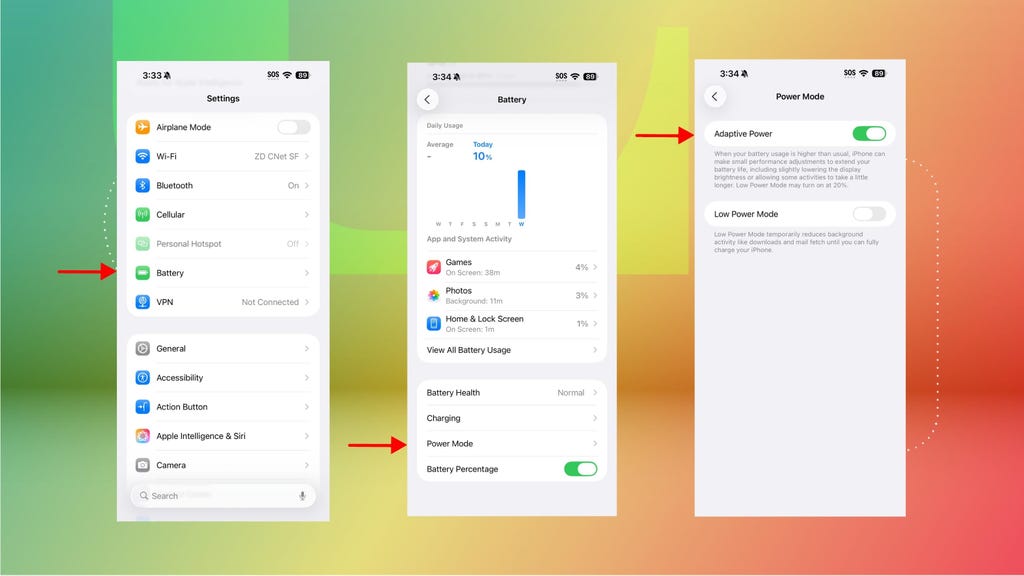 在iOS 26中,开启自适应电源功能以延长电池寿命。(图示为iOS 26开发者版本。)截图由Patrick Holland/CNET提供