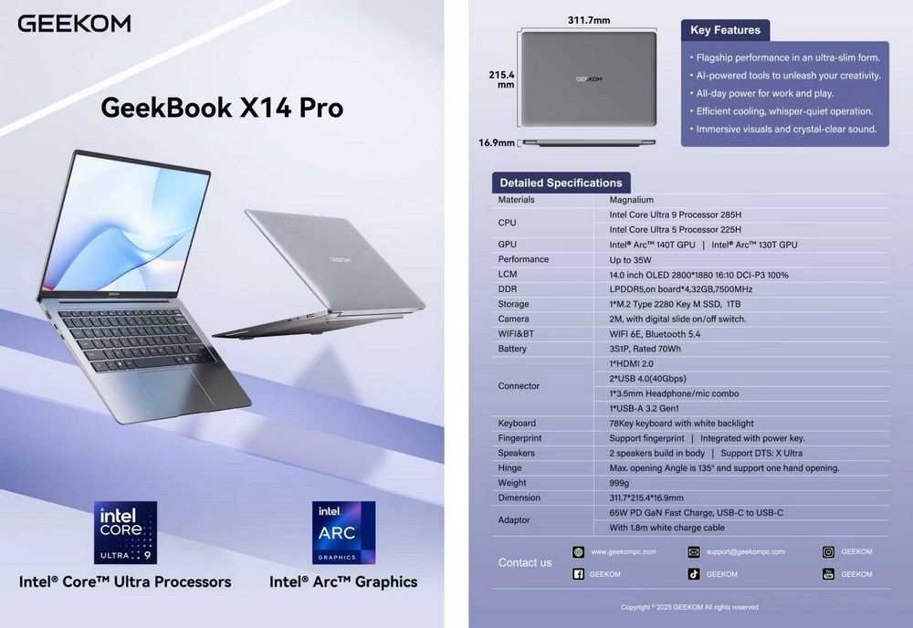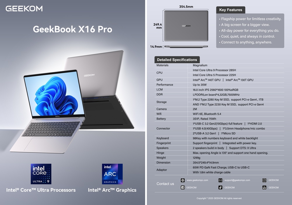 IT之家 9 月 8 日消息,迷你主机厂商 GEEKOM 积核在 IFA 2025 上展示了其首批笔记本电脑产品 GeekBook X14 Pro 和 GeekBook X16 Pro,两者均基于英特尔酷睿 Ultra 200H "Arrow Lake-H" 芯片平台。
