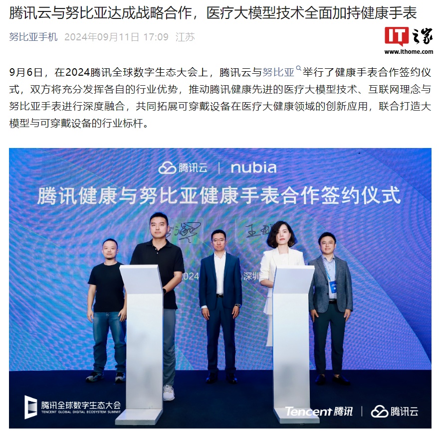 IT之家 9 月 12 日消息,努比亚官方昨日发文宣布,在 9 月 6 日的 2024 腾讯全球数字生态大会上与腾讯云达成战略合作,将推动腾讯健康医疗大模型技术、互联网理念与努比亚手表进行深度融合,拓展可穿戴设备在医疗大健康领域的创新应用。