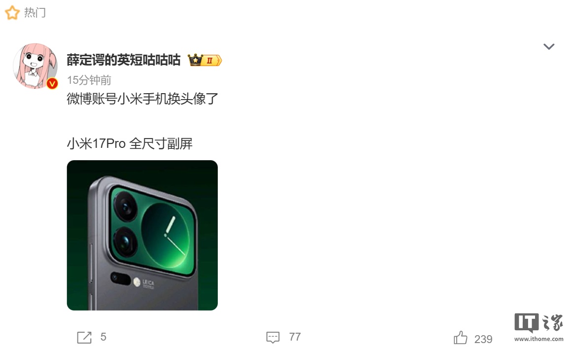 截至IT之家发稿,小米手机官方微博已撤下这个头像,换回了以小米 MIX Flip 2 钻石限定版为主题的头像。