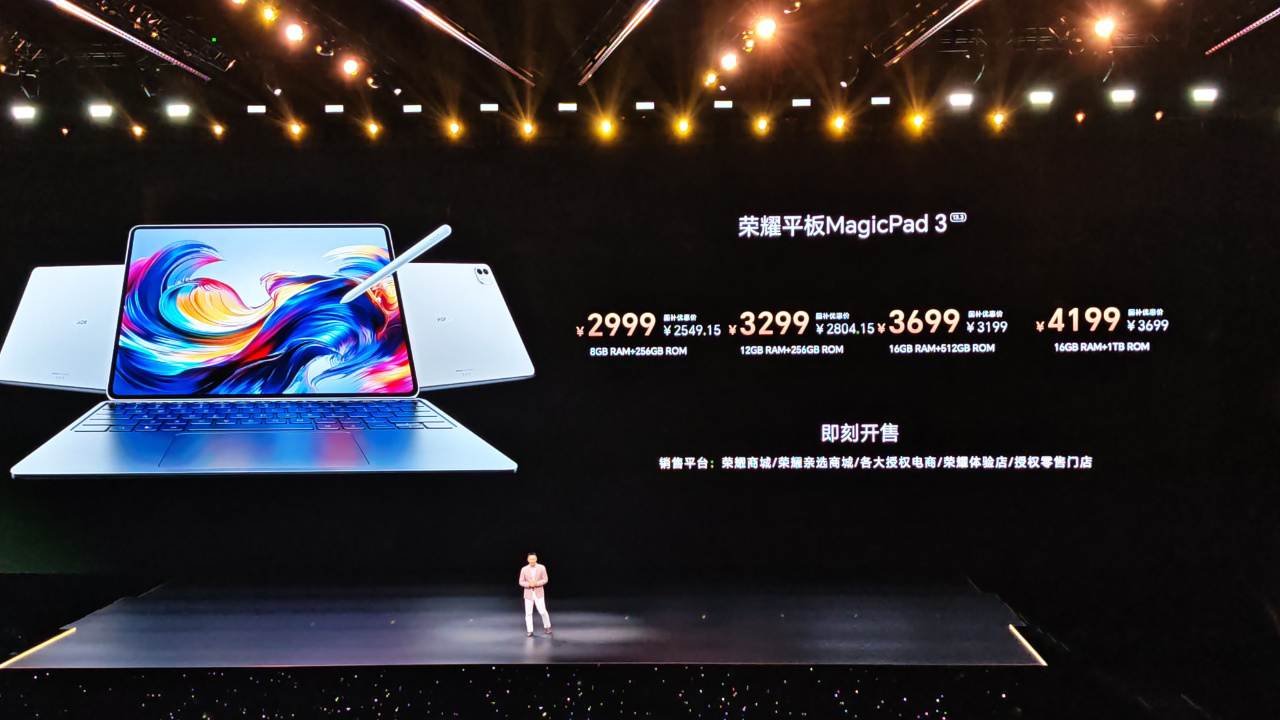 作为比较,今年 7 月发售的 MagicPad3 平板 13.3 英寸版本采用无断点全金属机身,可选月影白、浮光金及星空灰配色,整体厚度 5.79mm,轻至 595g,搭载一块 13.3 英寸 3.2K 分辨率 165Hz 护眼 LCD 屏,使用骁龙 8 Gen3 处理器,配备 12450mAh 青海湖电池,定价 2999 元起。