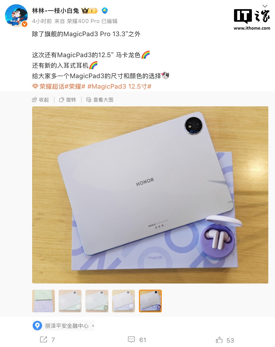IT之家 9 月 15 日消息,荣耀林林现已预热 MagicPad3 平板 12.5 英寸版本,参考官图,该机将采用“马卡龙”色系,可选两种配色,机身后置圆形单摄模组,同时配有触点和 IMAX ENHANCED 字样。