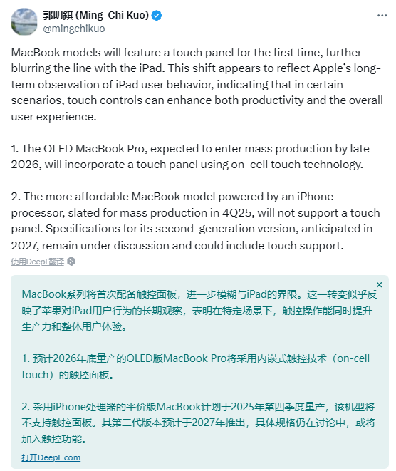郭明錤周三凌晨在X上透露了这一消息。“MacBook机型将首次配备触控面板,进一步模糊了它与iPad的界限,”他指出。“这一转变似乎反映了苹果对iPad用户行为的长期观察,表明在某些情况下,触控可以同时提升生产力和整体用户体验。”