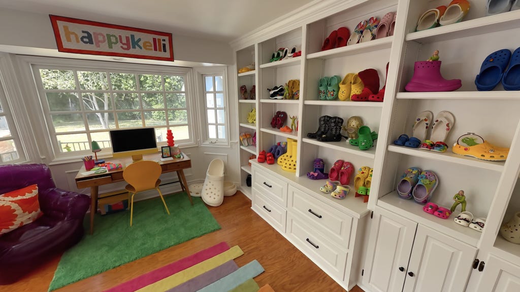 Meta的这款应用着实让我印象深刻,因为我预览到的最终效果——加州的一家糕点店、快乐凯利(Happy Kelli)的卡骆驰(Crocs)鞋室(里面摆满了卡骆驰鞋),以及说唱歌手钱斯(Chance the Rapper)那摆满巨大毛茸茸角色的工作室——感觉就像Quest 3摄像头上的穿透视频一样真实。