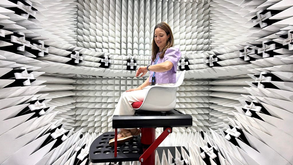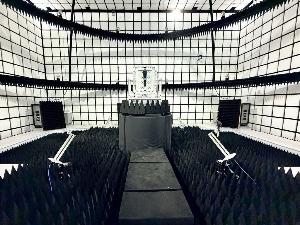 苹果在加利福尼亚州库比蒂诺总部附近的专用设施中进行了大量的连接性能测试。我们的参观之旅从一栋看似普通的建筑开始,这里通常不对外开放。我们穿过由黑色隔断构成的迷宫,我猜想这些隔断背后可能隐藏着数百个我们无权参观的测试区域。最终,我们来到了一个看似浴室大小、被软垫包裹的密室,室内布满了蓝色泡沫尖刺,宛如一个略带神秘感的录音棚。
