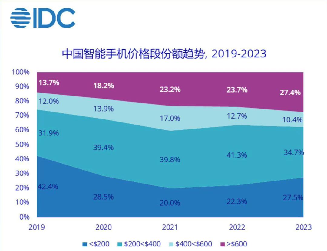 IDC公布的2023年中国智能手机市场价格段趋势数据指出,600美元以上高端手机市场份额达到27.4%,同比增长3.7个百分点。在高端消费人群维持购买力的同时,更多中端用户开始升级选择旗舰产品。