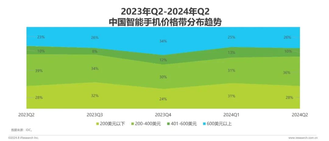 IDC数据显示:2023年,中国智能手机市场出货量为2.71亿台,同年全球智能手机出货量为11.7亿台,中国市场占比23%,是全球第一大市场;同时,2024年第二季度,中国智能手机出货量在200美元以下、200-400美元、400-600美元、600美元以上各价位段市场份额分别为28%、36%、10%、26%。
