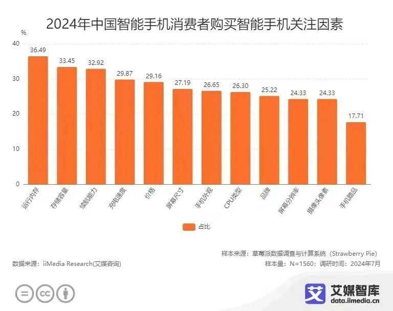 根据艾媒咨询发布的2024年中国智能手机用户调研数据,中国消费者在购买智能手机时对于运行内存、存储容量、续航能力、充电速度等都有着不小的关注度。厂商们通过推出多款不同配置与功能的机型,精准定位到某一特定用户群,满足消费者的个性需求:如游戏性能、摄影功能、续航能力、轻薄机身等,从而深入挖掘市场潜力。