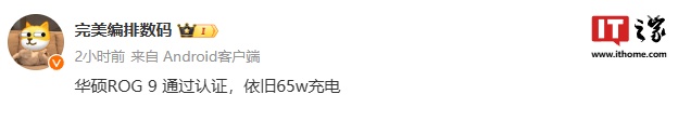 IT之家 9 月 14 日消息,一款型号为 ASUSAI2501A 的华硕新机于昨日(9 月 13 日)通过了 3C 认证,支持 65W 快充。据博主 @完美编排数码 透露,该机为 ROG 9。