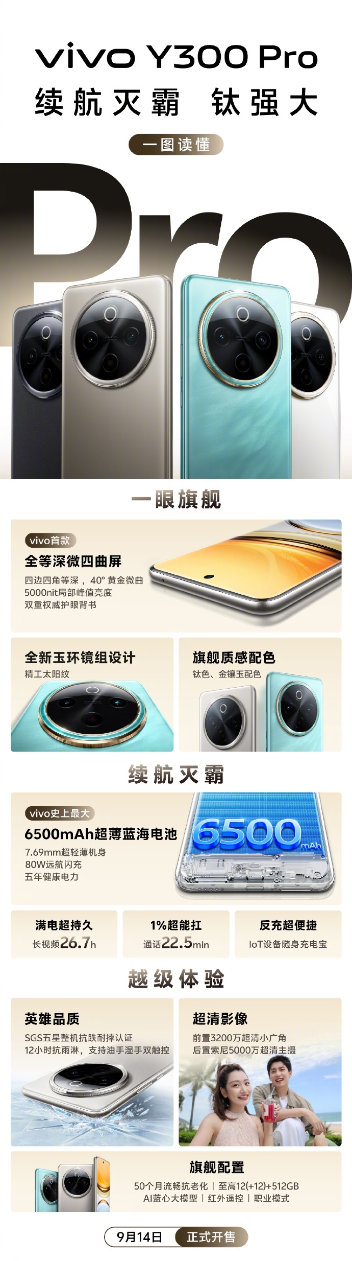 IT之家 9 月 14 日消息,vivo Y300 Pro 手机今日开启首销,提供钛色、金镶玉、羊脂白、墨玉黑 4 种配色可选,官方正价 1799 元起,京东补贴价 1794 元起。