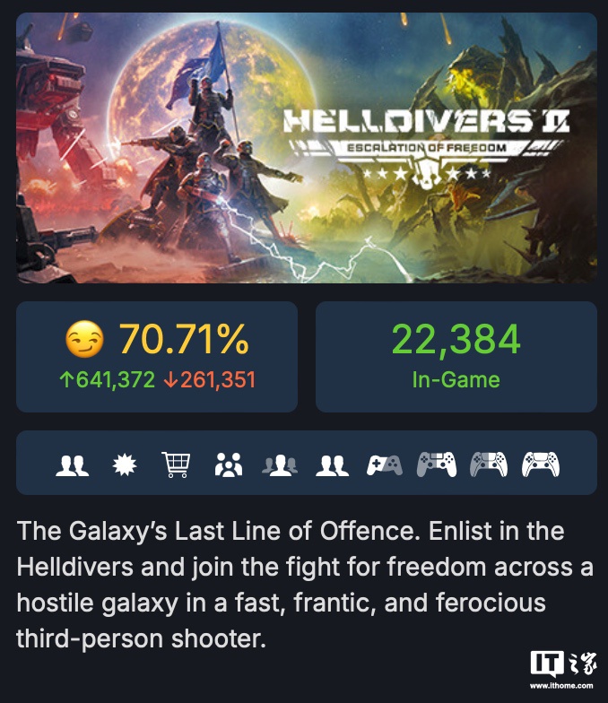 IT之家 9 月 14 日消息,索尼互动娱乐旗下第三人称团队射击游戏《绝地潜兵 2(HELLDIVERS 2)》现已在 Steam 平台迎来 8 折史低折扣,游戏原价 198 元,现优惠后 158.4 元,优惠将于 9 月 20 日结束,IT之家附游戏页地址如下(点此访问)。