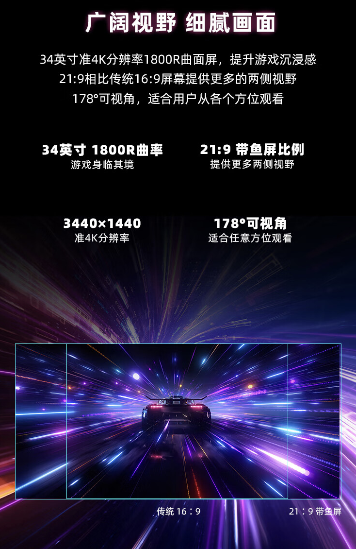 据介绍,这款显示器配备 3440 x 1440 分辨率 240Hz QD-OLED 面板(支持 HDMI / DP / USB-C 240Hz),曲率 1800R,亮度 1000 尼特,动态对比度 150 万:1,响应速度 0.03ms,支持 10-Bit 色彩,覆盖 99% DCI-P3 色域、97% Adobe RGB 色域。