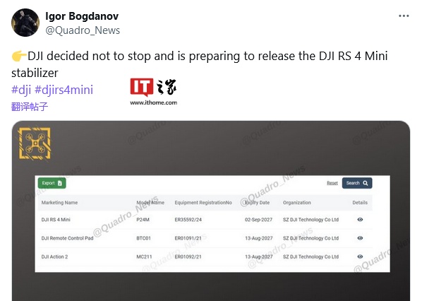IT之家 9 月 14 日消息,消息源 @Quadro_News 于 9 月 12 日在 X 平台发布推文,曝料称大疆即将推出 RS 4 Mini 轻量旅拍云台稳定器。
