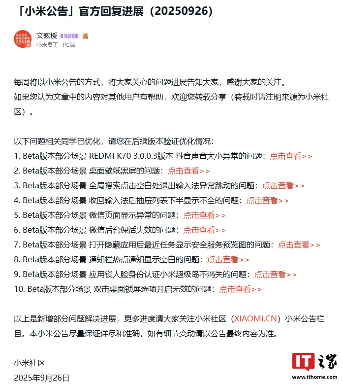 IT之家 9 月 28 日消息,小米员工本周在小米社区更新澎湃 HyperOS 的优化进展,其中提到用户所反馈的 Beta 版本部分场景桌面壁纸黑屏、微信页面显示异常 / 后台保活失效、打开隐藏应用后最近任务显示安全服务预览图等问题已优化,并表示用户升级后续版本后可验证优化情况。