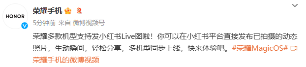 IT之家 9 月 14 日消息,荣耀今日宣布多款机型支持发小红书 Live 图,用户可以在小红书平台直接发布已拍摄的动态照片,需升级到 MagicOS 8.0 及以上版本。