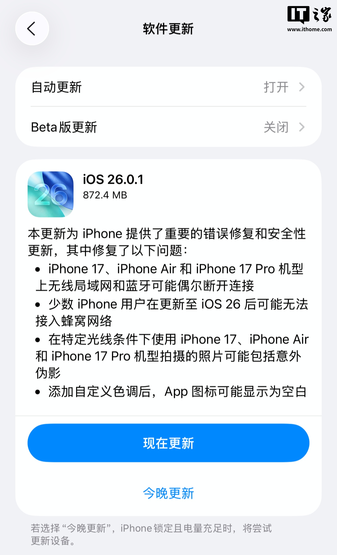 IT之家附上 iOS 26.0.1 更新官方日志内容如下: