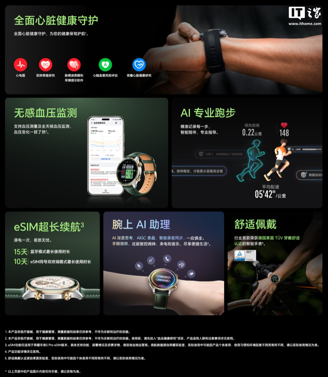 另外,荣耀手表 5 Pro 是行业首款荣获德国莱茵 TÚV 穿戴舒适认证的智能手表,eSIM 版支持长续航特性,蓝牙模式最长使用时长 15 天、eSIM 同号双终端模式最长使用时长 10 天。该款手表还内置腕上 AI 助理,支持 AI 深度思考、AIGC 表盘、智能录音同步,同时手腕微转可智控闹钟、来电和音乐等。