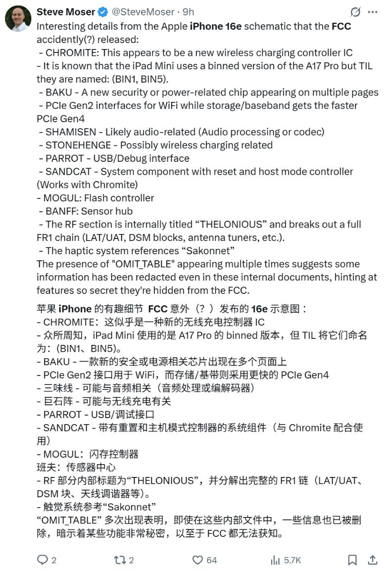 这不,在 X 平台上不少网友已经开始剖析这份文件中 iPhone 16e 的各种设计亮点: