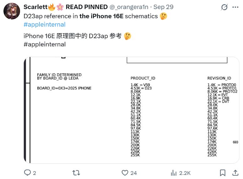 ● 有人截出了 iPhone 16e 的 D23ap 相关信息: