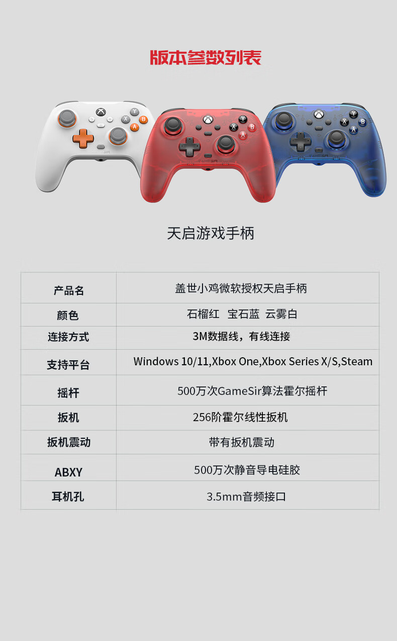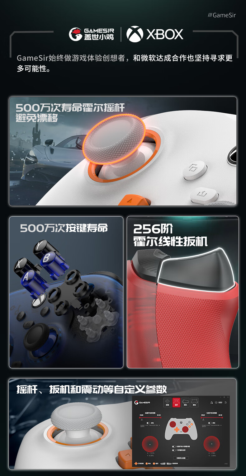 据介绍,该手柄支持五档震感的调节,以及霍尔线性扳机与快速扳机的双模式切换。其方向键、ABXY 键使用了导电胶按键,具备高达 500 万次的寿命,官方更称“高度复刻”微软原装手感。同时,其搭载了小鸡定制 500 万次超长寿命霍尔摇杆。