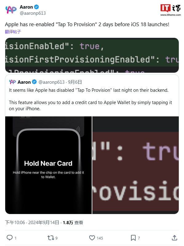 IT之家 9 月 15 日消息,消息源 Aaron Perris 昨日(9 月 14 日)在 X 平台发布推文,曝料称苹果公司已重新启用 Apple Pay 的“Tap to Provision”功能。