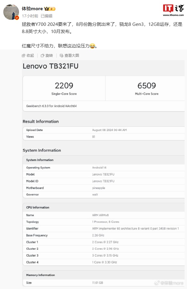 今年 8 月,有一款型号为 TB321FU 的联想新机现身 GeekBench,该机单核得分 2209,多核得分 6509,配备 12GB 运存,预计为新一代 Y700 电竞平板。目前,关于这款新品平板的具体参数,联想拯救者官方暂未公布。