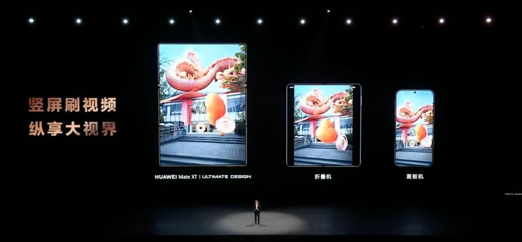 即使是定位高端,走商务大气路线的华为 Mate XT 都不能免俗,余承东演示旋转支架的一个重要场景,就是这款大屏手机如何实现竖屏刷短视频。